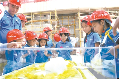 7月10日,“小候鳥”在深圳灣文化廣場項(xiàng)目工地參觀。7月10日至14日,來自中建科工23個(gè)建設(shè)者家庭的32名“小候鳥”在深圳與父母團(tuán)聚,共同參加“建功新時(shí)代 同心護(hù)未來”暑期“小候鳥”夏令營。新華社記者 梁旭 攝
