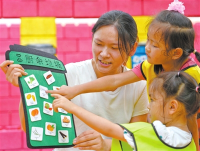 日前,江蘇省海安市墩頭鎮仇湖幼兒園開展“垃圾分類 你我‘童’行”主題教育活動,通過現場講解、互動游戲、模擬投放等環節,向孩子們普及垃圾分類知識,引導他們從小養成垃圾分類的好習慣。圖為教師利用垃圾分類卡片教孩子們正確分類垃圾。 通訊員 周強 攝