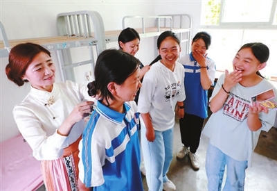 遵義市湄潭縣永興鎮完小原校長、鎮中心學校黨總支原副書記張靜梅來到流河渡學校,在學生寢室里細心地為一名留守女童梳理頭發。
