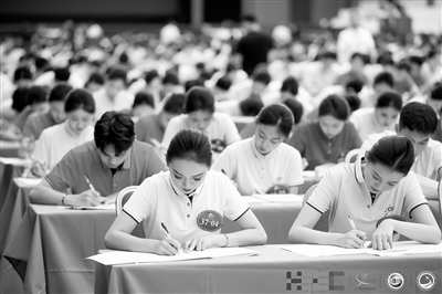 第十四屆全國(guó)高等學(xué)校民航服務(wù)技能大賽選手參加民航知識(shí)與英語(yǔ)比賽。