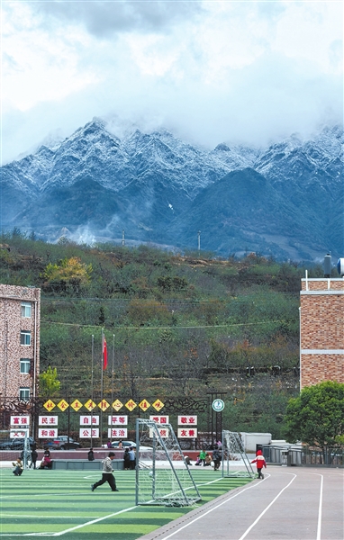 2024年12月底,宜東鎮中心小學的同學們在雪山下的校園踢球。 本報記者 葛仁鑫 攝
