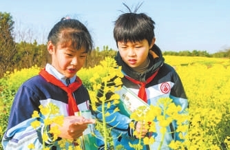 安徽師范大學(xué)附屬含山實(shí)驗(yàn)學(xué)校的學(xué)生在觀察油菜花。 歐宗濤 許麗 攝