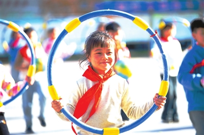 安徽省蕪湖市繁昌區繁陽鎮城關一小優化大課間體育活動,圖為學生們在參與呼啦圈操活動。 田園園 攝