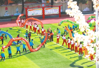 湖北省襄陽市樊城區太平店實驗小學以“大集體、大融合、大賽事”發動學生全員參與運動,圖為孩子們正在進行“龍過江”展示。楊東 聶志鵬 攝