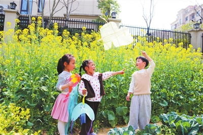 “兒童散學(xué)歸來(lái)早,忙趁東風(fēng)放紙鳶。”近日,浙江省江山市江東科技幼兒園里的油菜花爭(zhēng)相斗艷,孩子們鉚足了勁兒比賽做風(fēng)箏。他們用塑料膜、紙板自制各種奇形怪狀的風(fēng)箏,并用彩筆繪制專屬圖案,通過(guò)研究風(fēng)向、風(fēng)力,調(diào)整風(fēng)箏的結(jié)構(gòu)、重量,努力讓風(fēng)箏翱翔天際。圖為孩子們?cè)诜棚w自制的風(fēng)箏。劉玉蘇 攝