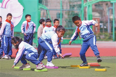 近日,山東青島王埠小學積極開展豐富多彩的課間活動,讓孩子們走出教室,走進陽光。校園里,紅彤彤的笑臉上洋溢著純粹的快樂,矯健的身影留下活力的軌跡。圖為學生在課間進行“小馬過河”趣味游戲。