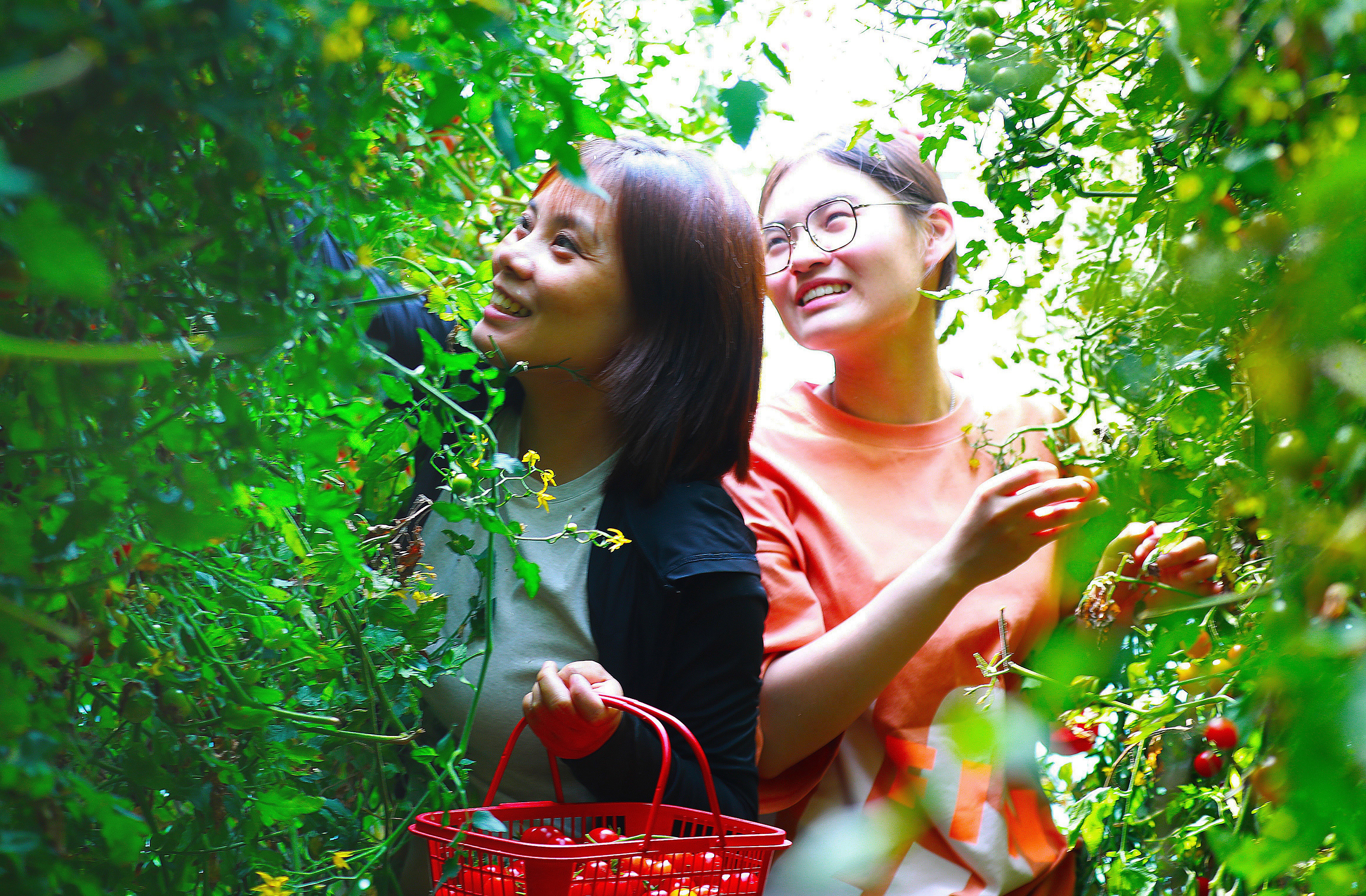 在旭弘生態園,李芊諾與游客一起采摘西紅柿。