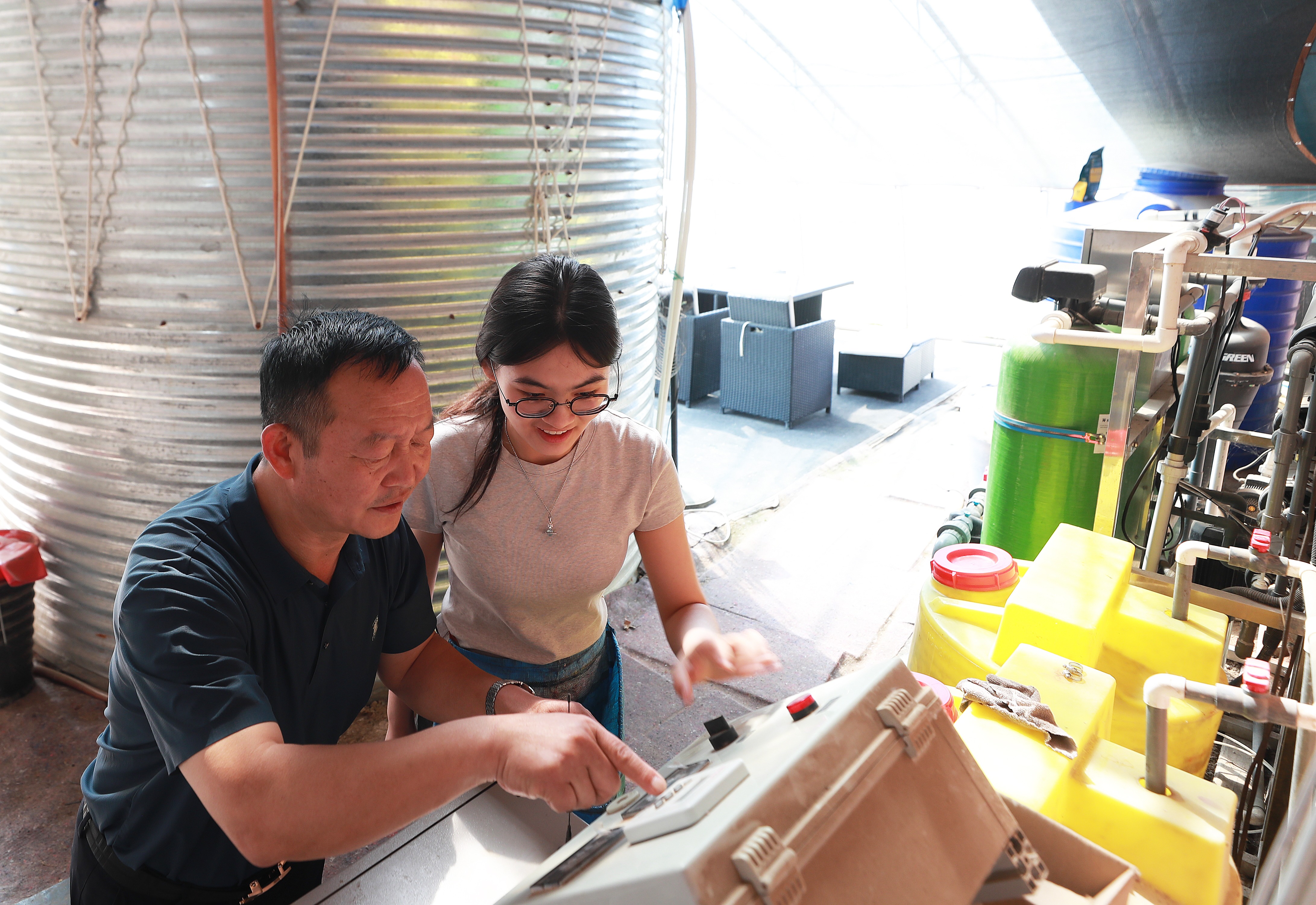 在旭弘生態園,李芊諾向技術人員了解自動澆灌設備的使用情況和操作方法。