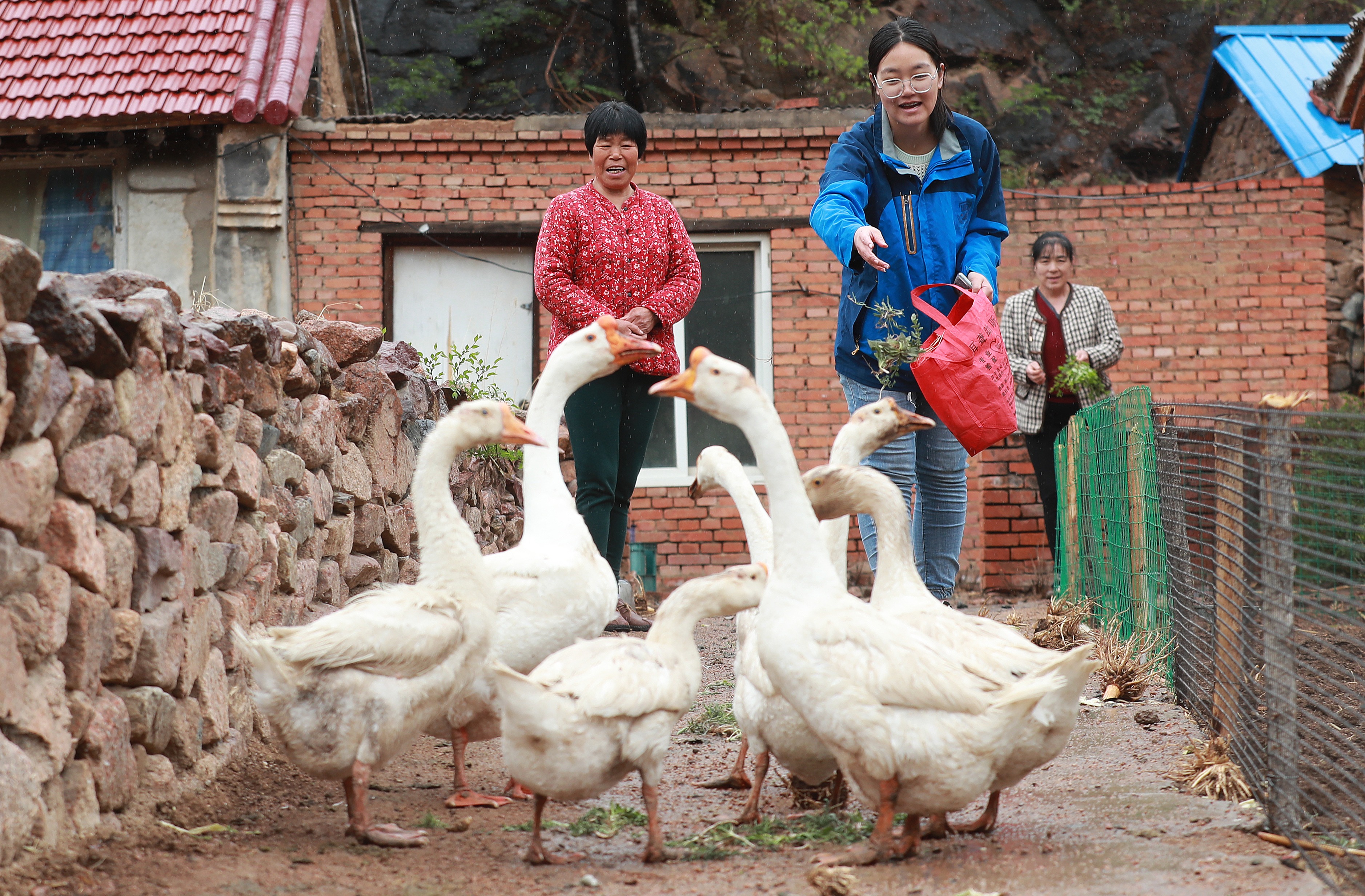 蘇乙桐到姑姑家了解庭院經濟發展情況時,給大鵝投喂青草。