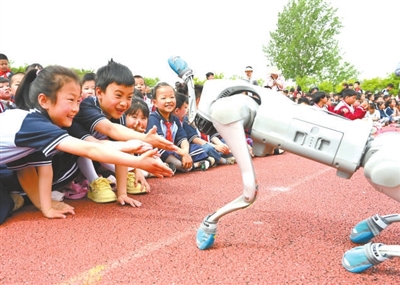 5月13日,在江蘇省徐州市睢寧縣李集鎮(zhèn)中心小學(xué)科普活動(dòng)現(xiàn)場(chǎng),學(xué)生在和智能機(jī)器狗互動(dòng)。近日,由江蘇省婦女兒童基金會(huì)、省青少年科技中心聯(lián)合開(kāi)展的“百校科普行——科普進(jìn)校園”活動(dòng)走進(jìn)李集鎮(zhèn)中心小學(xué),通過(guò)豐富多彩的科學(xué)教育活動(dòng),培育青少年的科學(xué)意識(shí)和動(dòng)手實(shí)踐能力,點(diǎn)亮孩子們的科學(xué)夢(mèng)想。洪星 攝