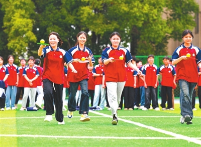 近日,湖北省襄陽市樊城區竹條實驗中學開展校園心理減壓活動。學生們通過推桿跑、綁腿競速、背夾球、托網球往返跑等特色游戲,釋放壓力,感受運動帶來的快樂。 楊紅枚 攝