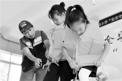 7月4日,在山東省青島市市北區(qū)宜陽(yáng)路小學(xué)暑期休業(yè)式上,學(xué)生們?cè)隗w驗(yàn)正確穿戴救生衣。通訊員 王海濱 攝
