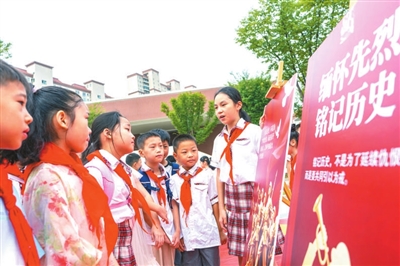 江蘇省海安高新區實驗小學學生在校園內參觀弘揚偉大抗戰精神海報展。翟慧勇 攝