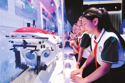 山東省青島市市北區開平路小學開展科普研學活動,學生們在青島科技館參觀“蛟龍號”載人潛水器復制品(模型)。王海濱 攝