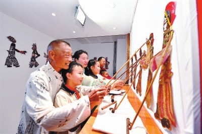 湖北省襄陽市??悼h城關鎮小學組織學生走進??悼h文化館,開展“體驗多彩非遺,感受文化魅力”主題研學活動,圖為民間皮影藝人指導學生表演皮影戲。楊韜 攝