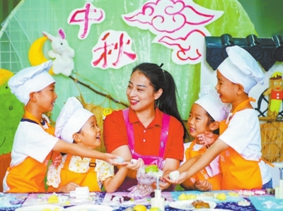 9月25日,江蘇省泰州市姜堰區(qū)第三實驗幼兒園的小朋友們體驗制作月餅。 周社根 攝