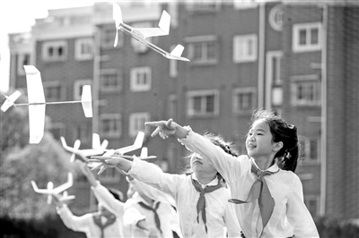 近日,江蘇省南通市通州區(qū)實(shí)驗(yàn)小學(xué)的學(xué)生在操場(chǎng)上放飛自己制作的橡筋動(dòng)力滑翔機(jī)。