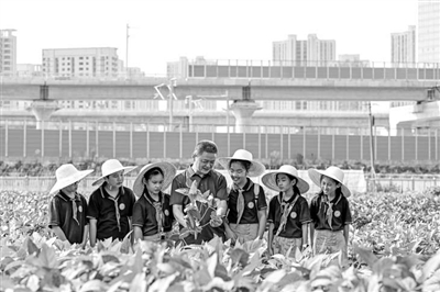 在安徽省農業科學院大豆種植研究基地,來自合肥市廬陽區四河小學的學生正在學習大豆種植的生長特點。