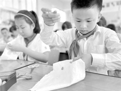 學生參加學校勞動技能大賽之釘紐扣。 煙臺市芝罘區魯峰小學供圖