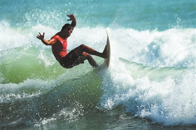在沖浪男子短板決賽中,18歲的海南隊選手吳世棟戰勝對手奪冠。