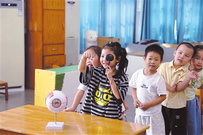 近日,浙江省諸暨市暨南街道街亭幼兒園開展“近視防控,從小做起”主題活動。孩子們通過做陽光亮眼操、參加戶外活動等,掌握愛眼護眼知識,提高視力保護意識。圖為孩子們在做視力檢測。陳霞芳 攝