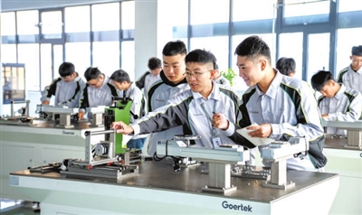 在歌爾匠造中心機(jī)械裝調(diào)理實(shí)一體化教室里,學(xué)生在學(xué)習(xí)典型機(jī)械結(jié)構(gòu)裝配調(diào)試。資料圖片