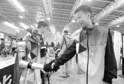 北京市建華實驗學校六年級學生在同“華啟明”人形機器人進行握手互動展示。本報記者 單藝偉 攝
