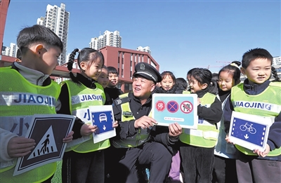 11月27日,河北省邯鄲市交巡警支隊民警教邯山區渚河路第二小學學生識別交通標志。 郝群英 攝