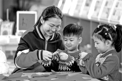 近日,在山東省青島市李滄區青山路幼兒園,老師指導小朋友學習剪紙。張鷹 攝