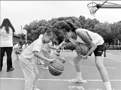 安徽師范大學“陽光體育”愛心夏令營實踐團成員(右一)教小學生打籃球。朱海兵 攝