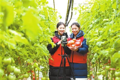 1月29日,在山東省濱州市博興縣店子鎮辛朱村,返鄉大學生志愿者在大棚里幫助農民網絡直播推銷西紅柿。 陳彬 攝